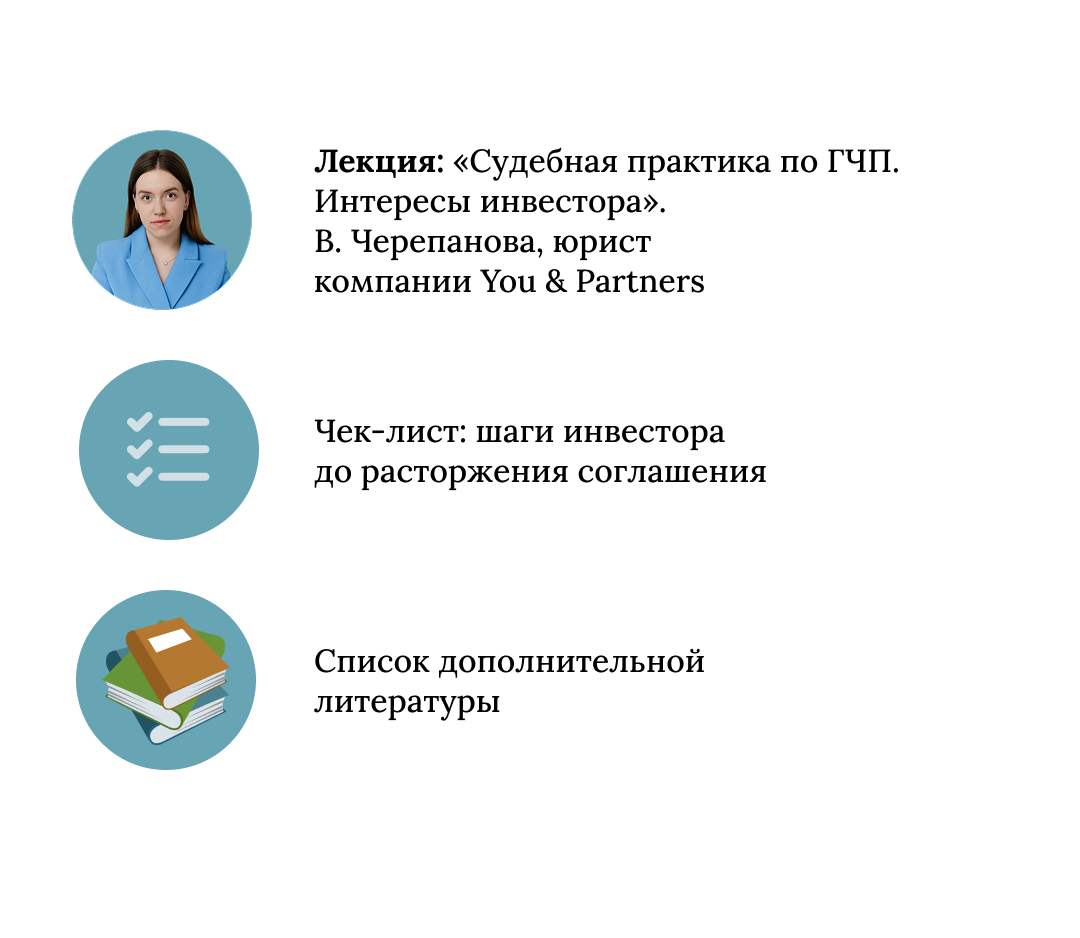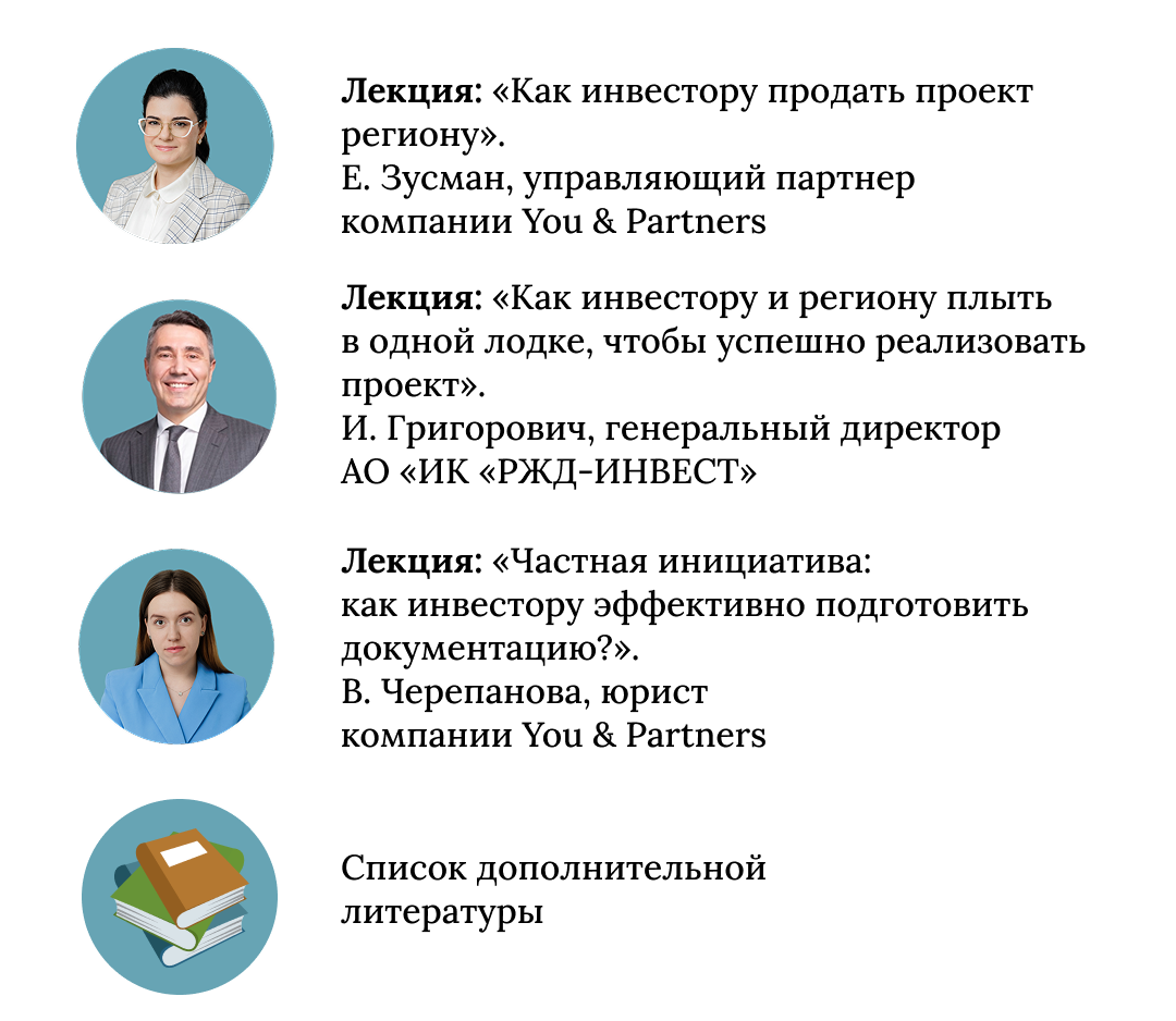 4 лекции от спикеров — экспертов с 15+ летним опытом в сфере ГЧП. Полезные бонусные видео, чек-листы и аналитические материалы, которые помогут еще больше погрузиться в специфику темы.
